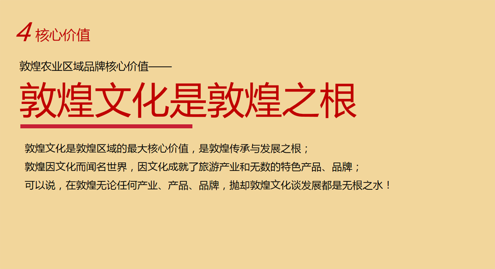 過程:借勢敦煌超級IP知名度,充分利用天然流量,助推敦煌農業品牌構建;立足敦煌農業產業優勢,捆綁敦煌旅游超級體量,推動農旅融合發展,形成“三帶一”敦煌特色農業崛起模式;以農業為載體,品牌賦能產業,立足敦煌文化藝術,開創敦煌“藝術農業”塑造品牌靈魂,實現品牌化崛起!